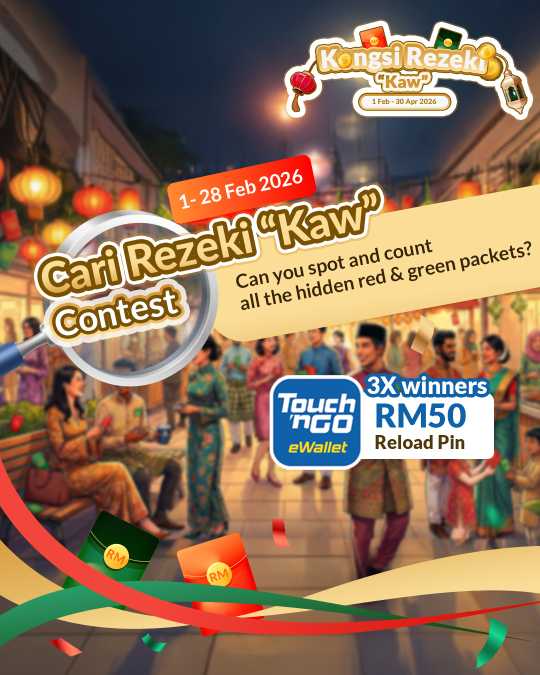 Look out for new visuals every month in February, March, and April throughout the campaign period and spot all the hidden red and green packets. Lucky winners will receive RM50 Touch ’n Go Reload Pin!